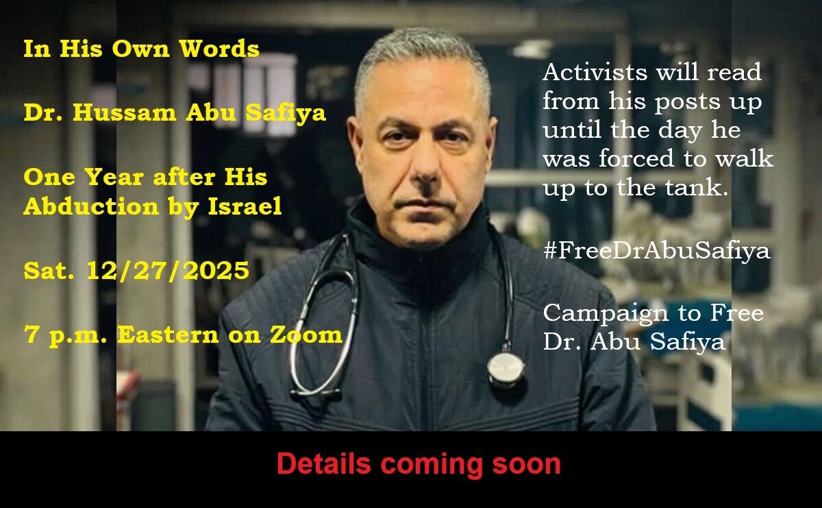 The same day, December 27, Zionist soldiers kidnapped Abu Safiya along with other members of the staff of Kamal Adwan. Some reports say there were dozens of abductions. Other reports say hundreds.